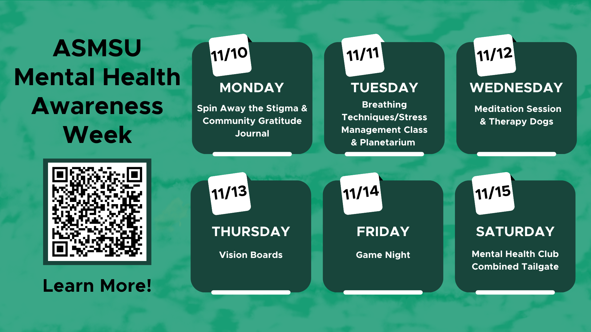 ASMSU’s Mental Health Awareness Week runs from Monday, November 10 through Saturday, November 15. This is a week dedicated to promoting mental wellbeing and connecting students with resources, support, and community. Together, we can foster a campus culture where every Spartan feels seen, supported, and empowered to prioritize their mental health. View the events calendar here.